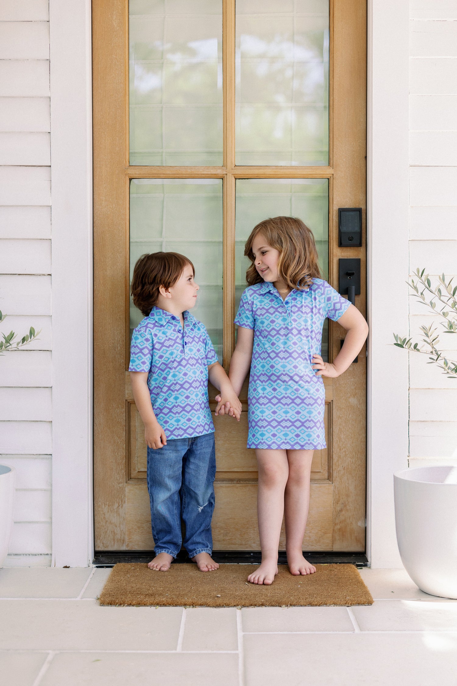 Keep your little girl cool, comfortable and stylish this summer with Pops Polos! This blue and purple Aztec polo dress is perfect for all your summer occasions and is available in a matching men's polo + boy polo!