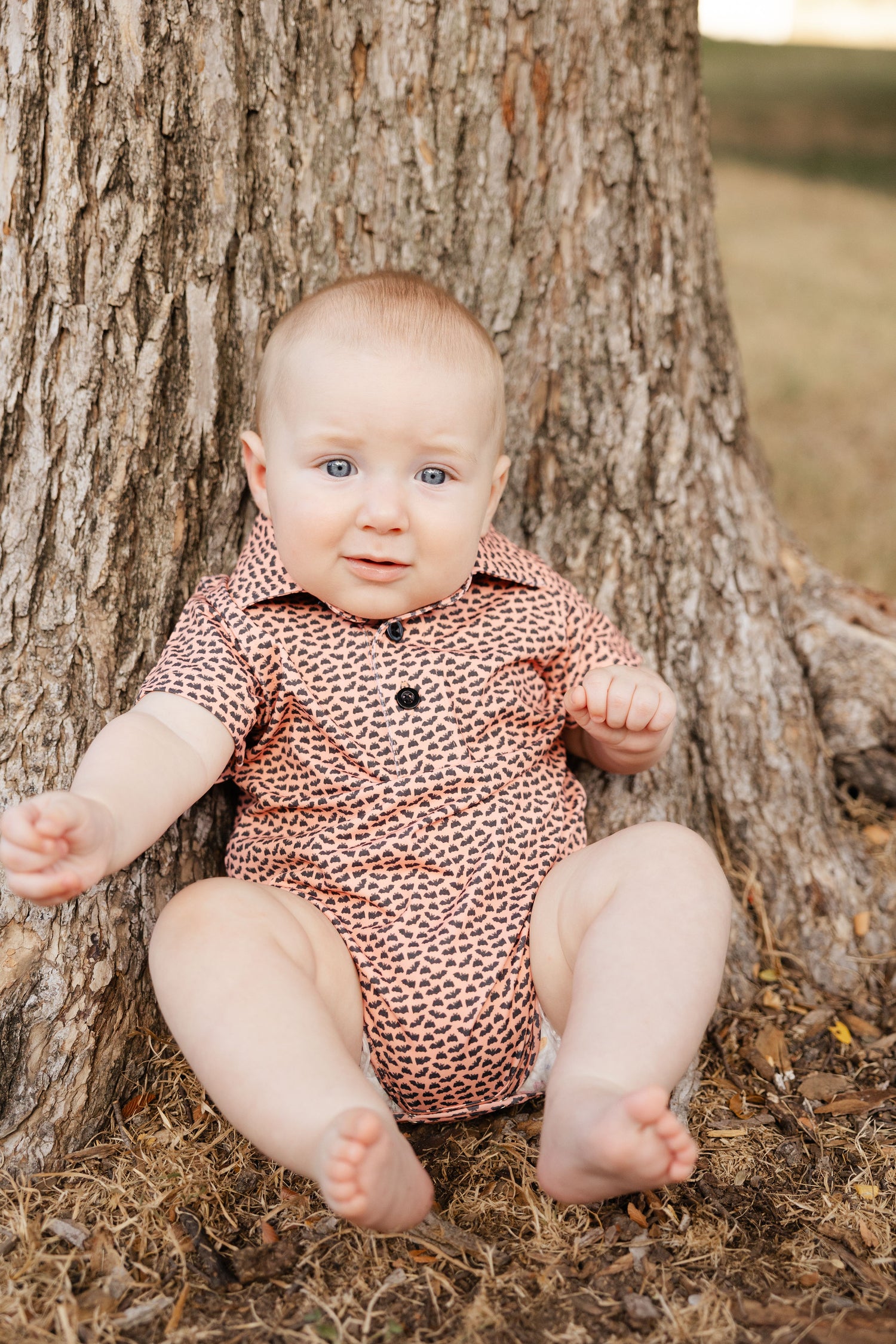 Enjoy a fun matching moment with dad during the Halloween season with this orange and black bats polo onesie!