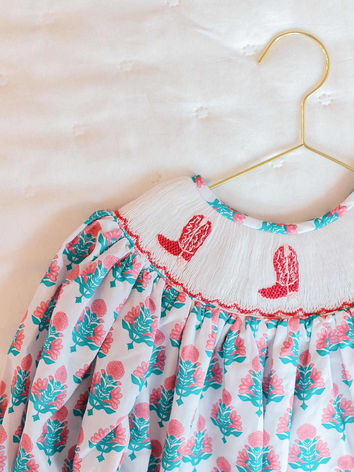 Round up the perfect wardrobe for your little cowgirl with this smocked boots bubble, just in time for rodeo season!