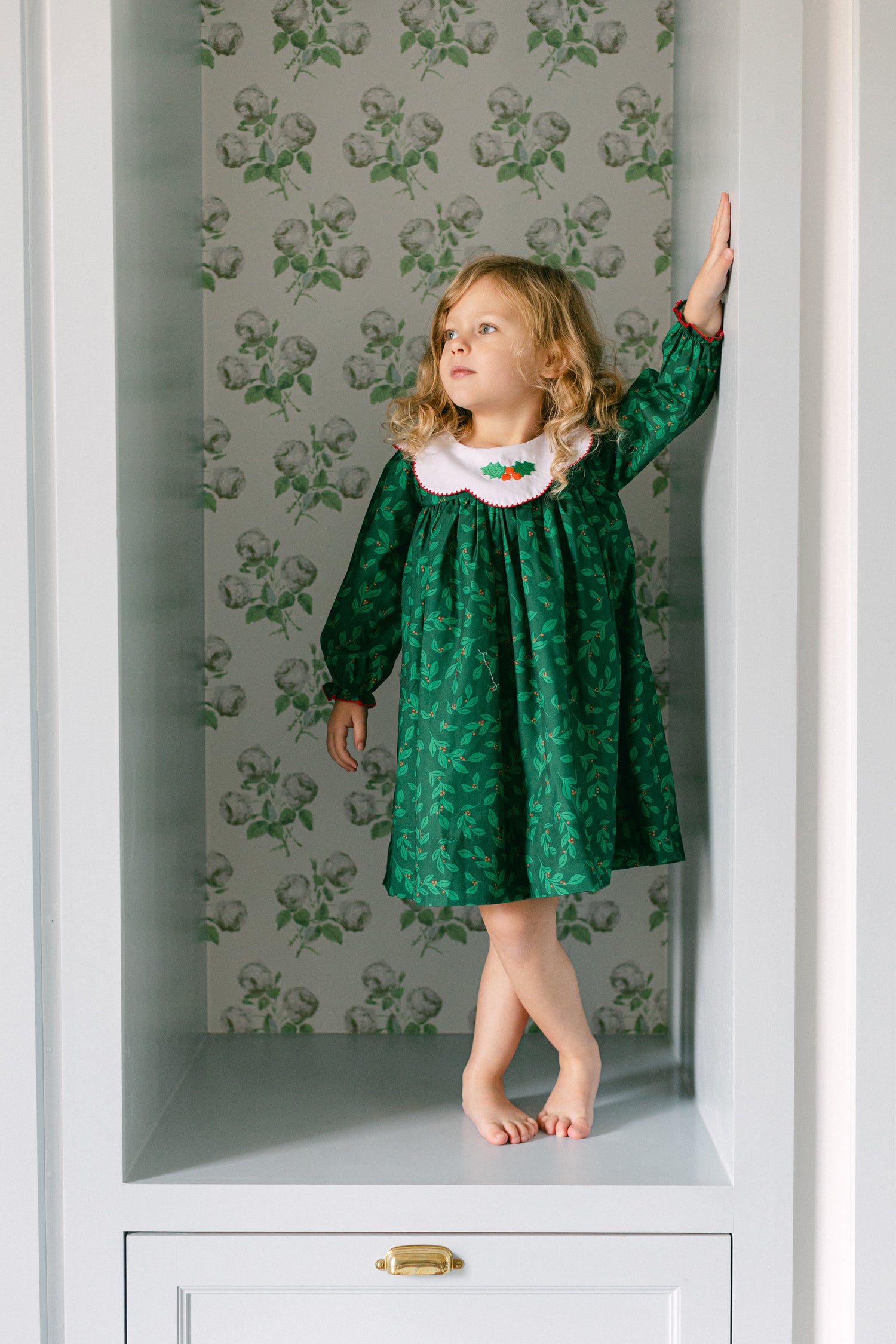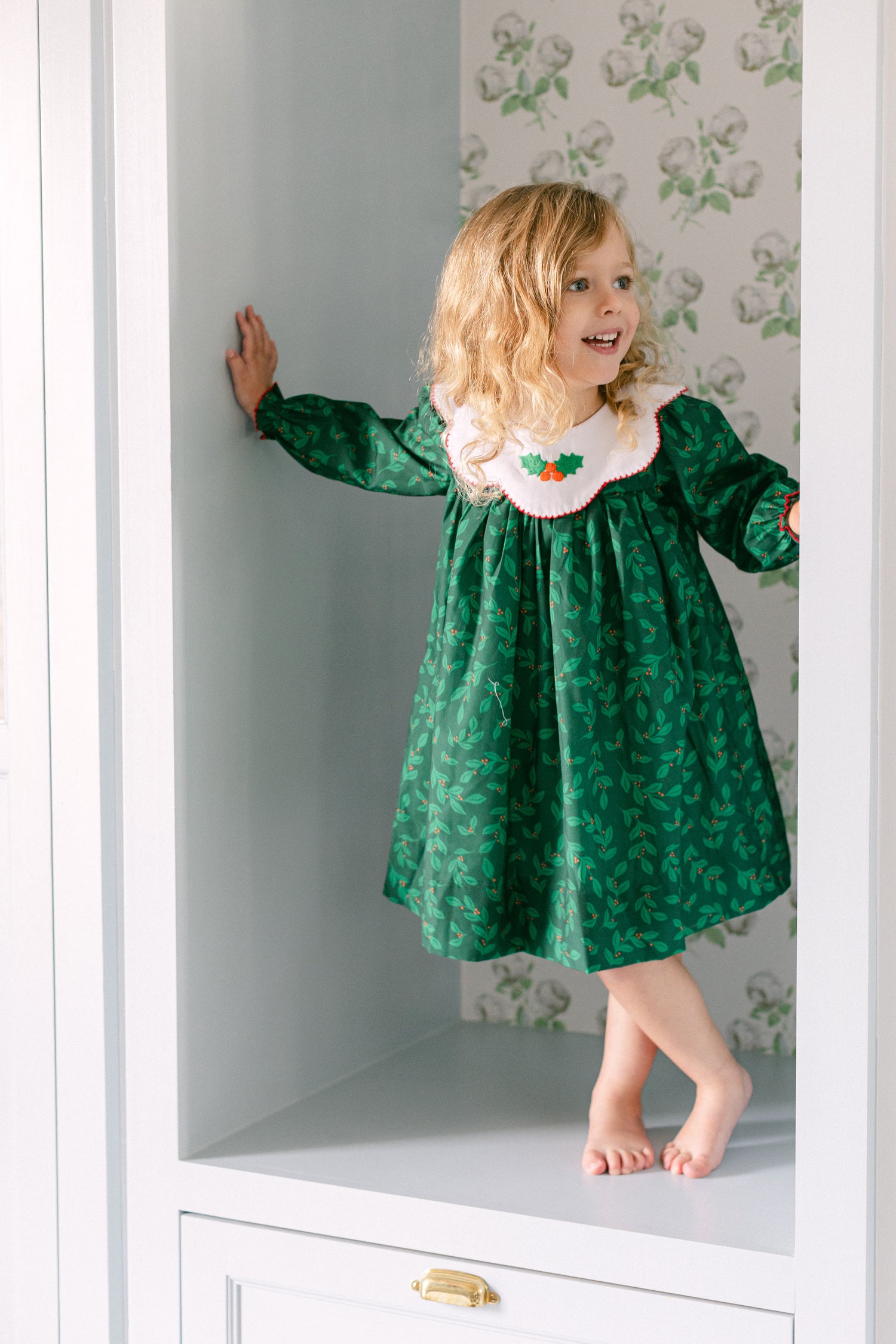 Deck the halls with boughs of holly and dress your little girl in the cutest embroidered holly dress too!
