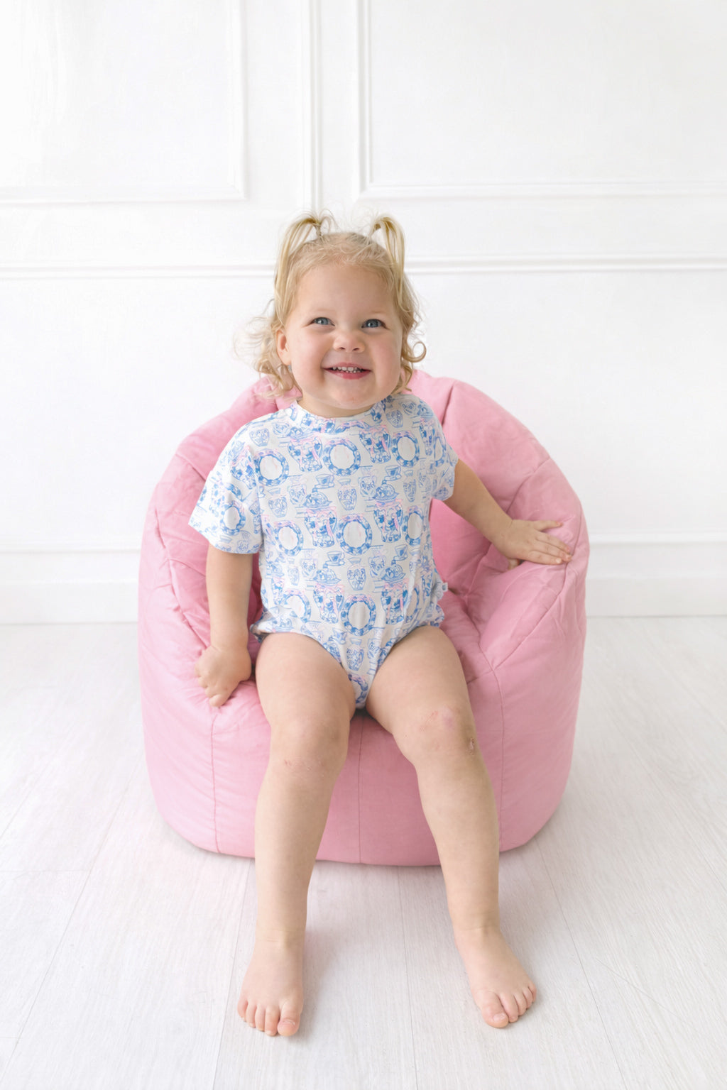 Our popular bamboo t-shirt bubble is back in the cutest porcelain print! These are a perfect go-to outfit for infants and toddlers, all spring and summer long!